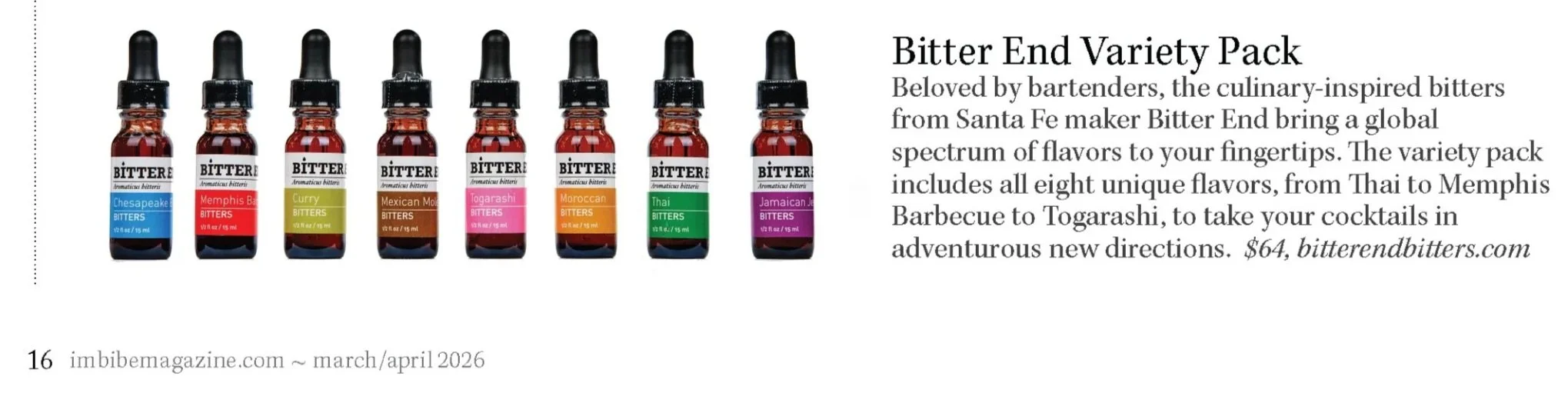 Founded and based in Santa Fe, New Mexico, Bitter End has been on the cutting edge of cocktail flavorings since 2010. Designed to put a radical spin on traditional bitters, our concentrated elixirs are based on culinary flavors from around the globe that are known for tongue-tingling chile-based heat. With their distinctive aromas and intense, complex flavor profiles, Chesapeake Bay, Curry, Jamaican Jerk, Memphis Barbeque, Mexican Mole, Moroccan, Thai, and all-new Togarashi will help you create a world of adventurous new cocktails.